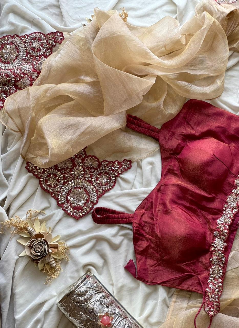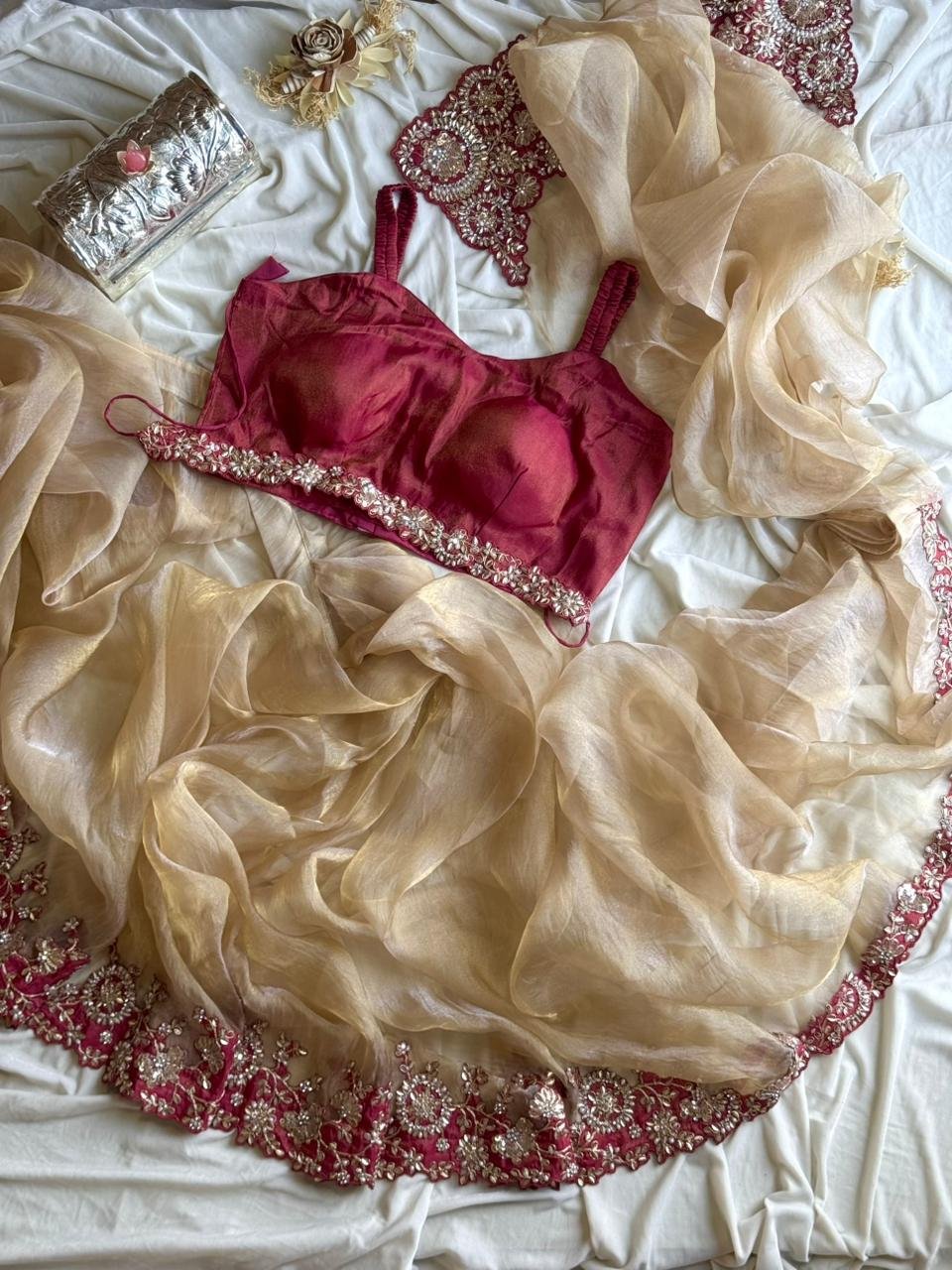 Crystal organza satin saree with coding sequence, Embroidery & pearl work on border as shown