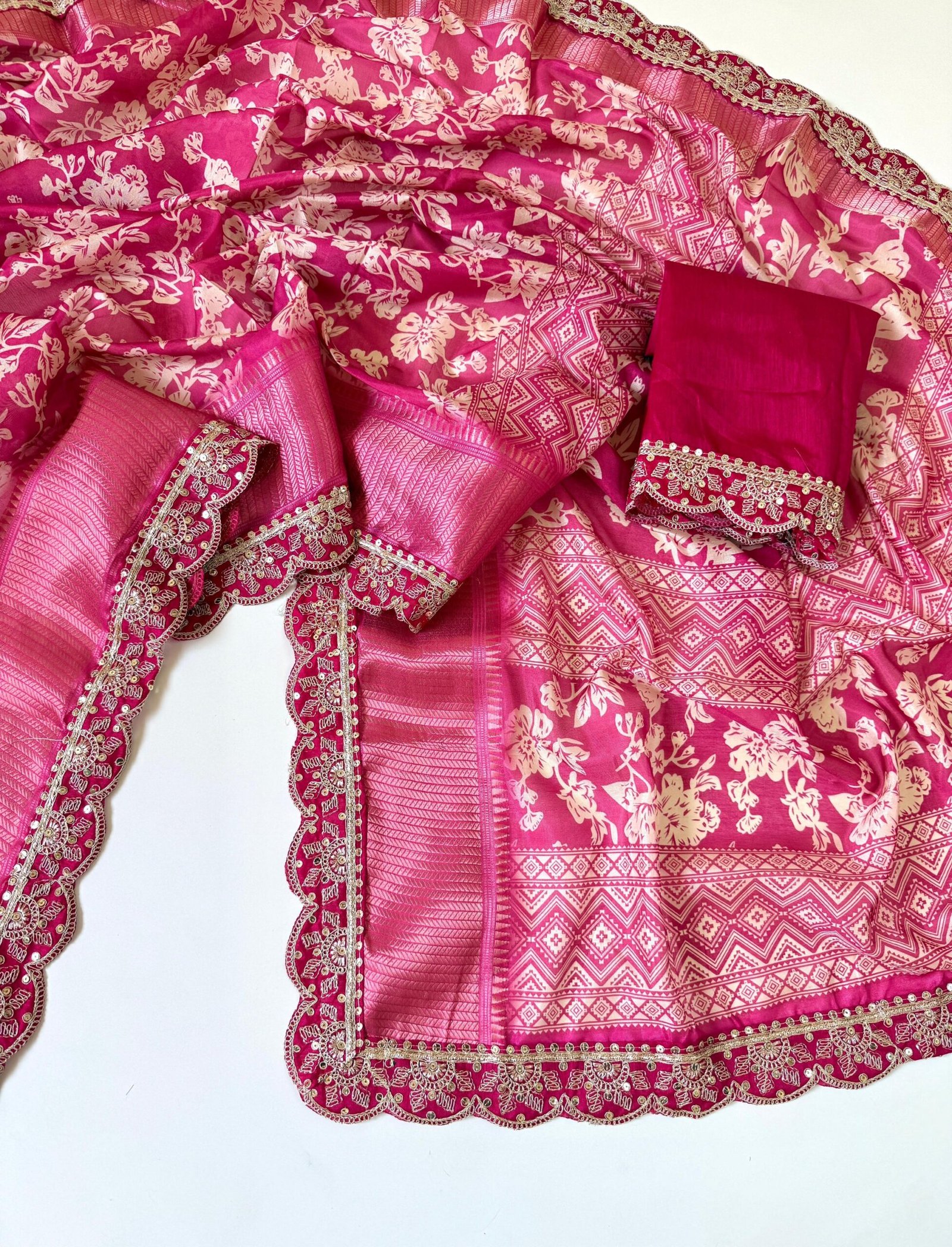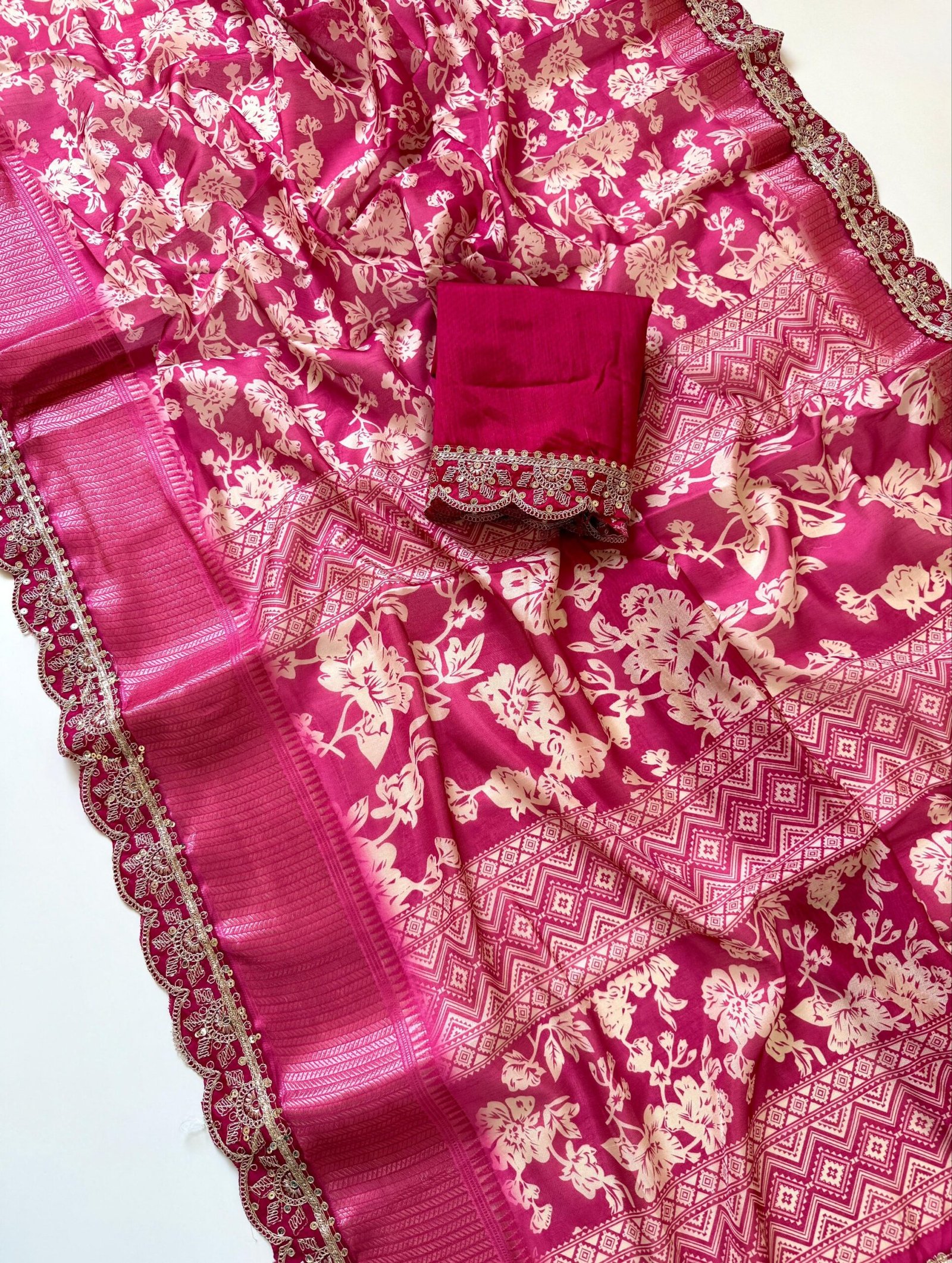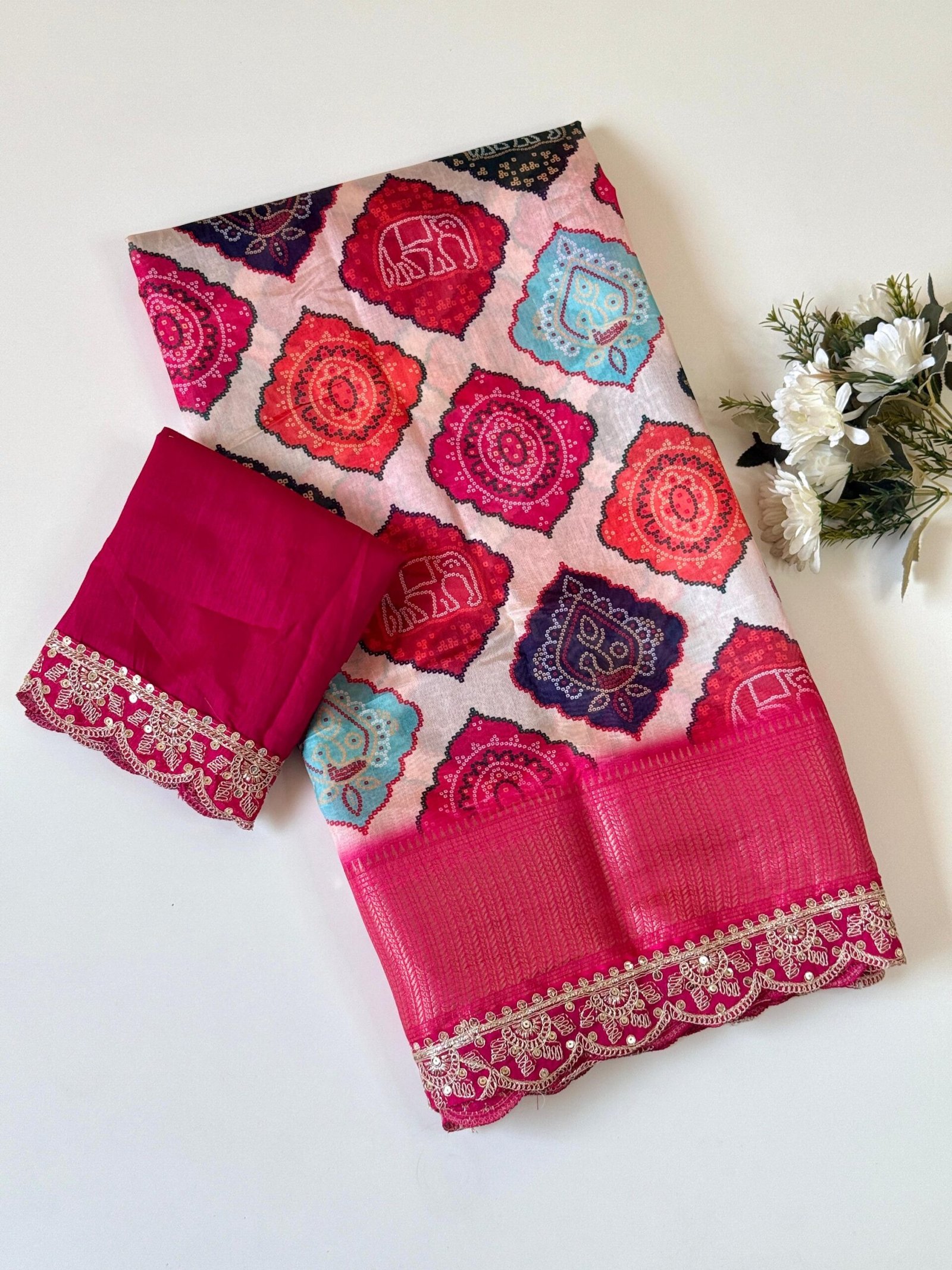 ▶️ *_Fabric – Designer Dola Banarasi Weaving Fabric With Beautiful Bandhej & Floral Digital Print And Full Sequence Embroidery Work Border With Banglori Blouse👚*_