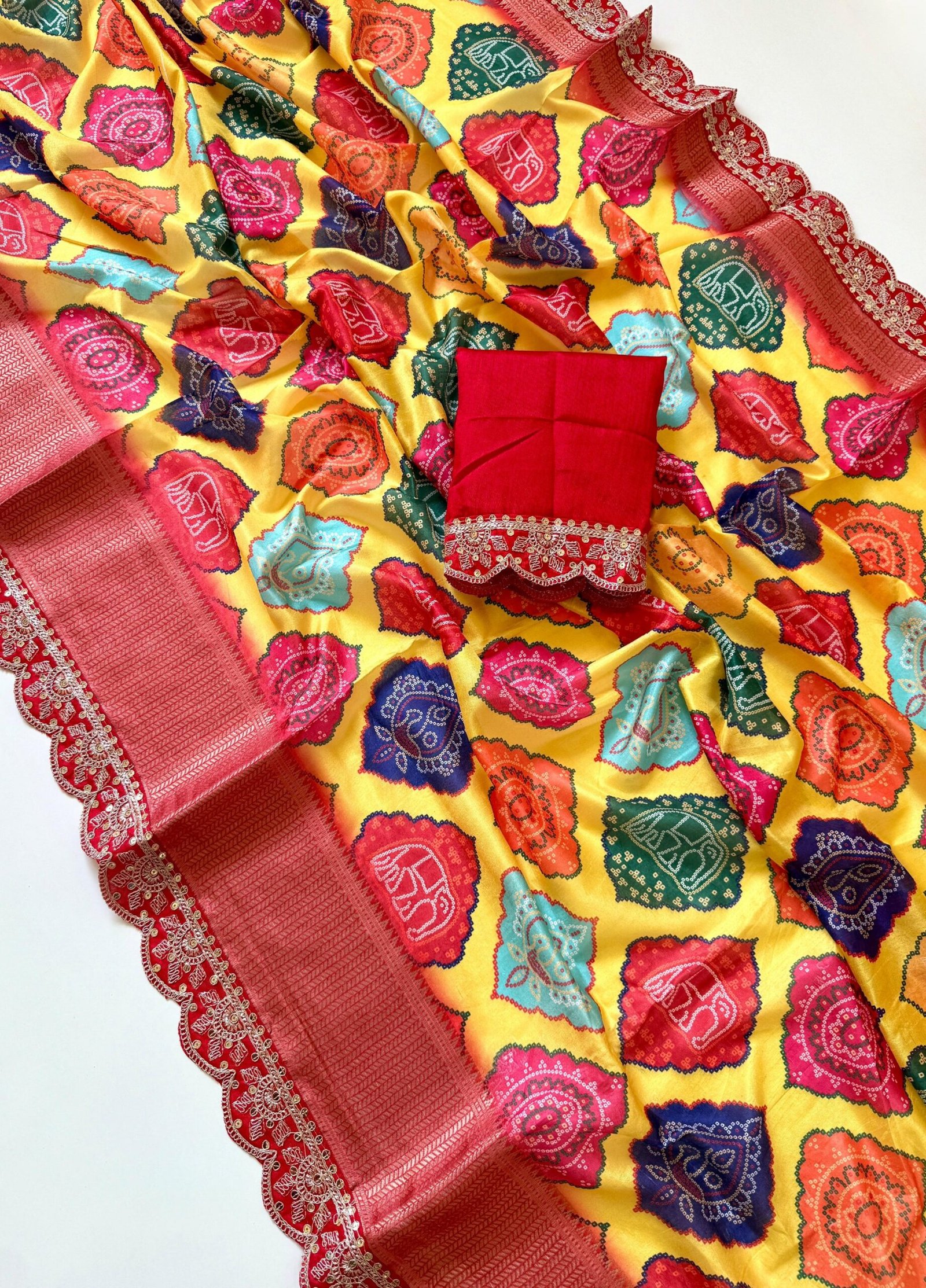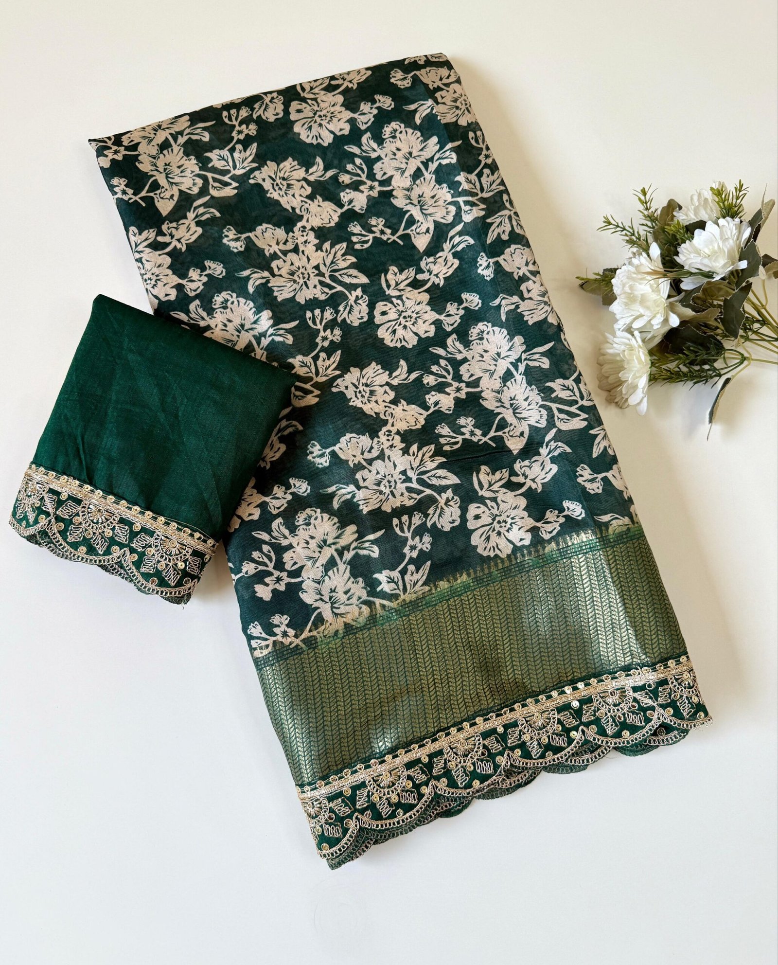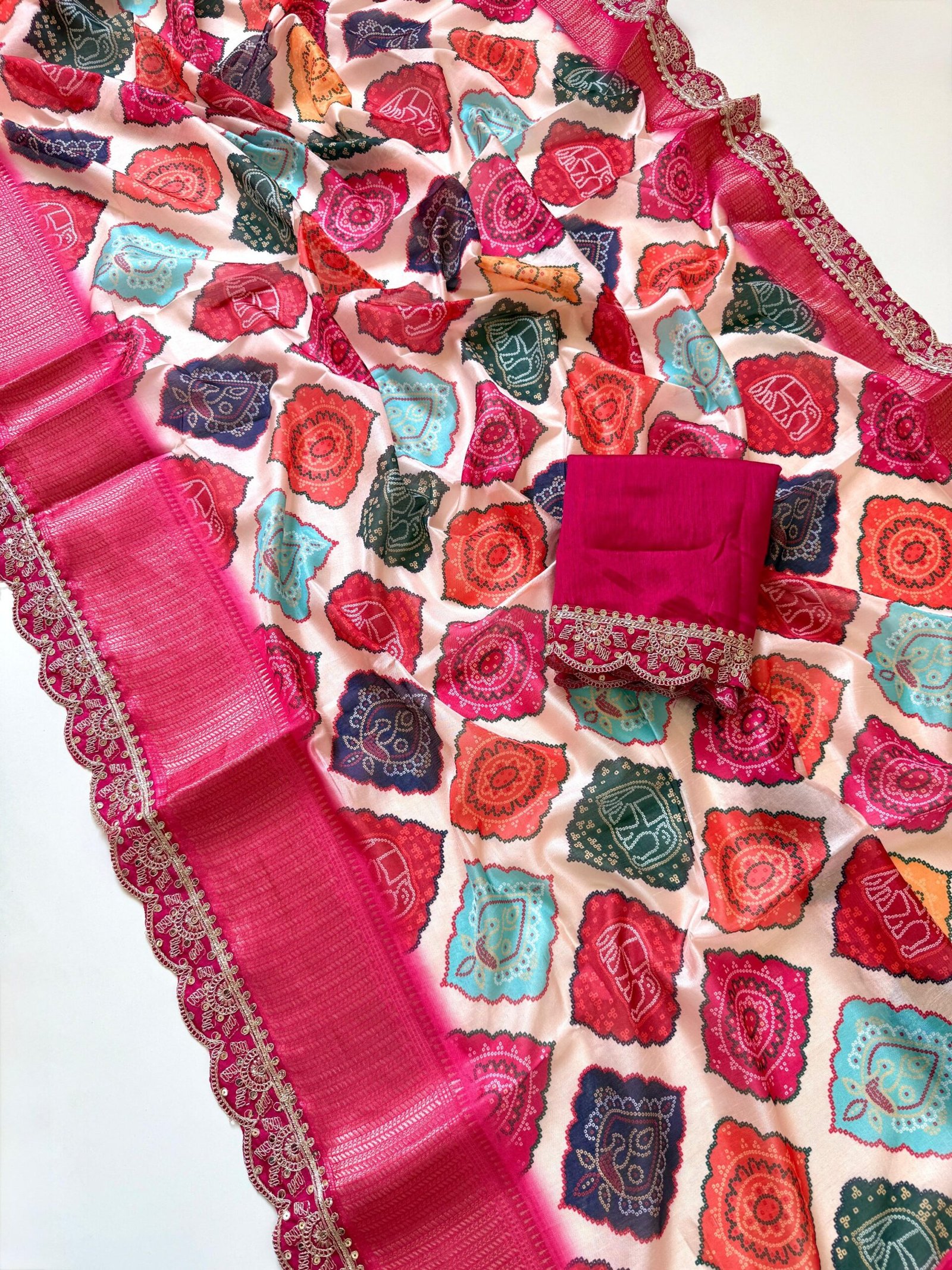 ▶️ *_Fabric – Designer Dola Banarasi Weaving Fabric With Beautiful Bandhej & Floral Digital Print And Full Sequence Embroidery Work Border With Banglori Blouse👚*_