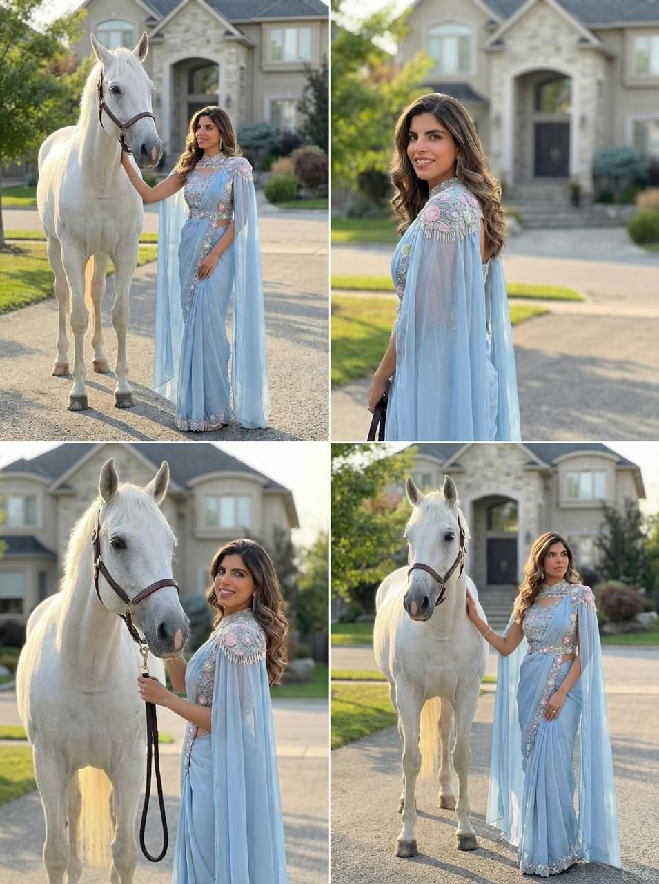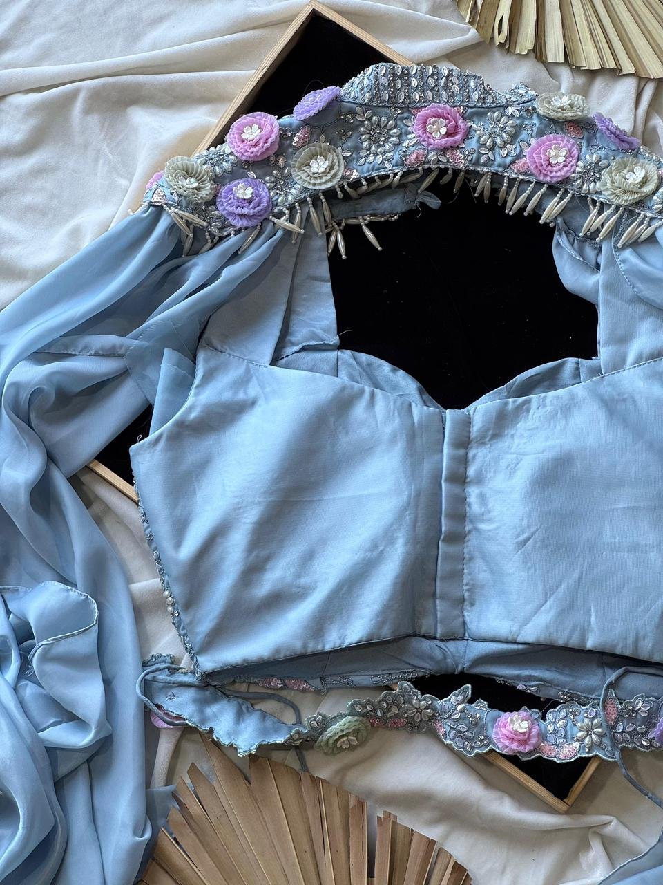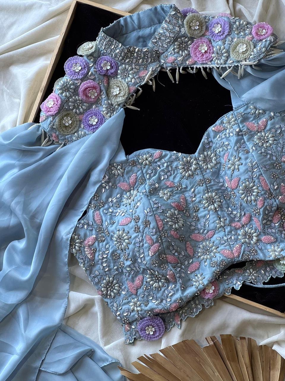 Teamed with stitched blouse & Neck work belt with frill hands as shown ( Free Size Fits Upto 42)